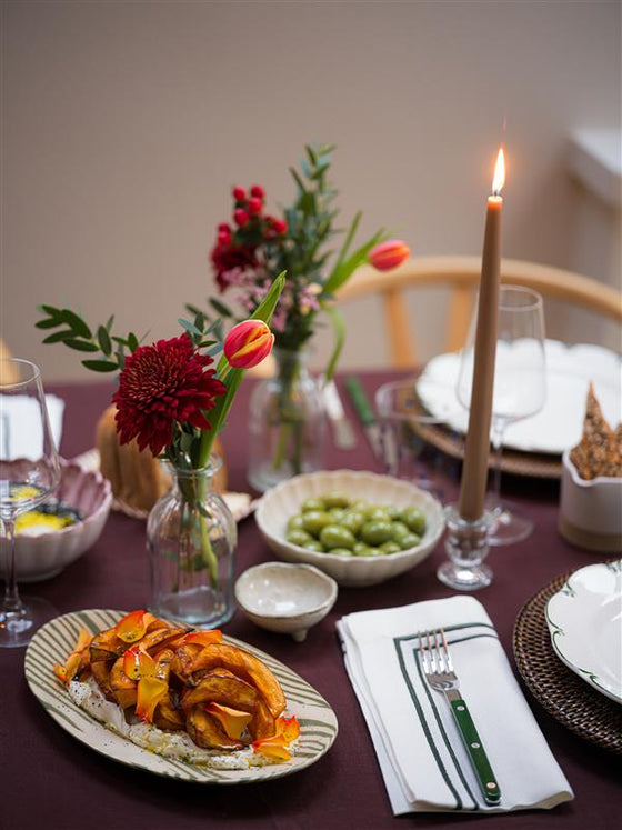 Cutlery, take your pick: The Classic Cutlery collection in Fern Green. I gravitate towards white tablecloths a lot of the time and find that green touches pair so well and when you start to layer things in like your chicken, the orange of a pumpkin, the burgundy of a beetroot, you know that green will just always work.